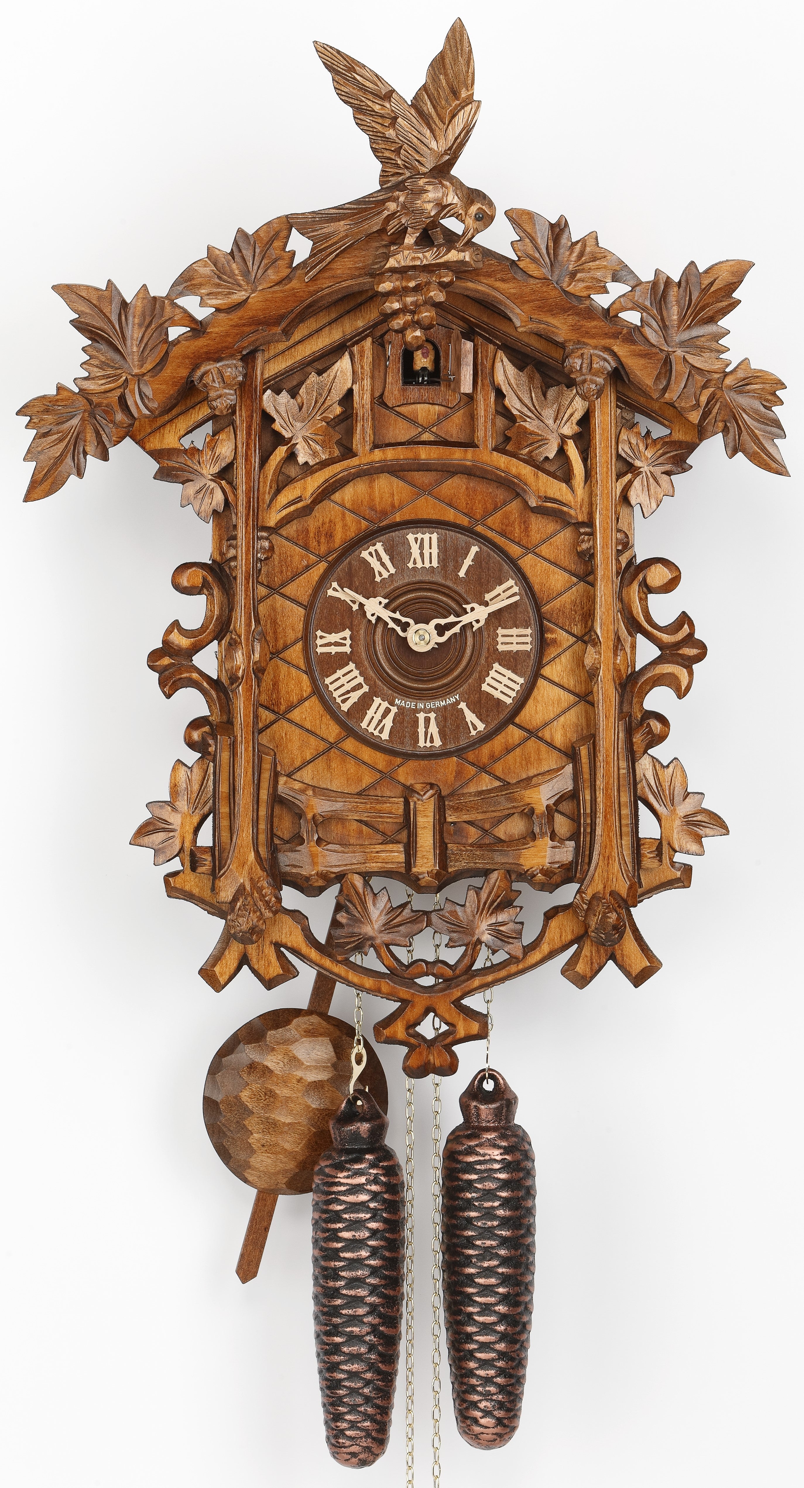 Chalet-Clocks with their traditional Black Forest house-style or carved clocks with leave-decoration? Choose your prefered style andexplore Black Forest cuckoo clocks in our online shop!