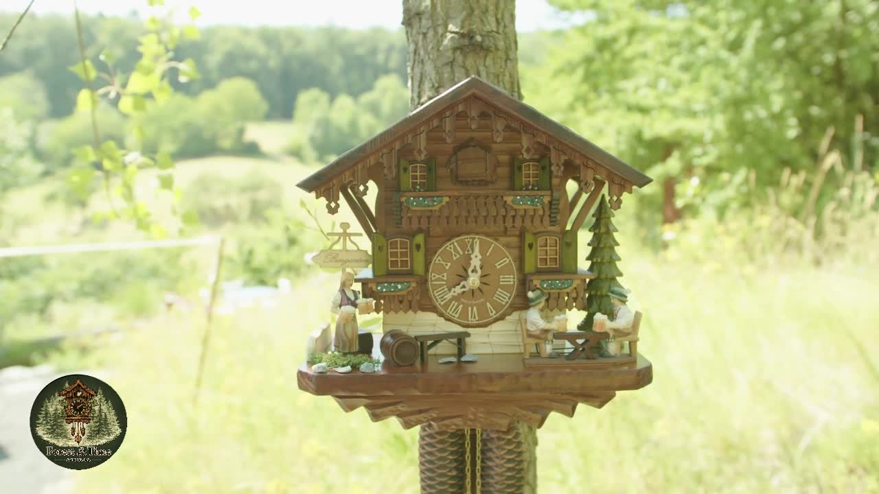 This beautiful and traditional Black Forest House features a movable, hand-carved and hand-painted beer drinker that move to the cuckoo's call. At half-hours and on the hour the 2 beer drinker are toasting with beer steins. The cuckoo bird is carved, the dial, numerals and hands are all made of wood. For the night you can shutdown the calling and the music.