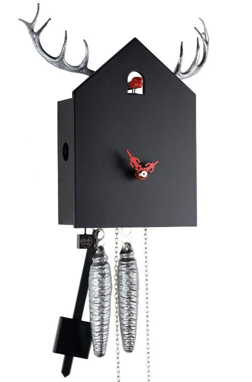 Black Modern Cuckoo Clock with silver deer andlers is a modern mechanical cuckoo clock with an elegant design.